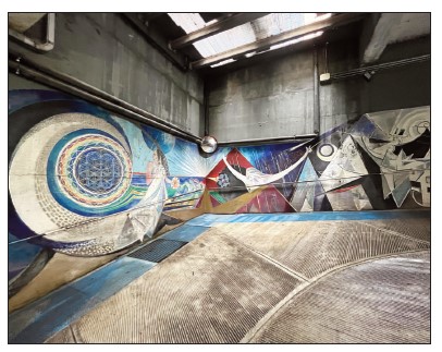 Il colpo d’occhio arriva appena si scende la prima rampa, quando compare una enorme farfalla verde e azzurra posta quasi ad indicare due direzioni di marcia. Sulle ali sono rappresentate due Mandala: si tratta di un disegno o un motivo geometrico, che rappresenta il cosmo e le divinità in diversi mondi, ma che può esprimere diversi significati.