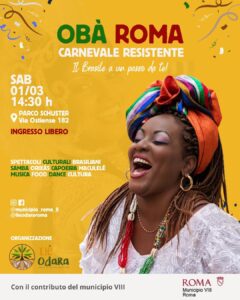 A Parco Schuster, sabato 1° marzo, anche un evento per i più grandi. L’appuntamento è per le 14:30. L’Asd Ile Odara Roma, in collaborazione con il Municipio VIII, porteranno Obà Roma – il Carnevale Resistente, con la musica e la cultura afro-brasiliana, tra le strade di San Paolo. Un evento unico che regalerà al territorio una giornata intensa di musica dal vivo, danze tradizionali brasiliane, capoeira, samba, forrò e tanto altro.