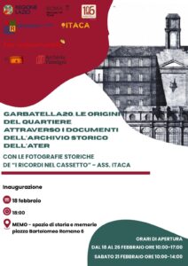 Sempre mercoledì, alle ore 18:00, presso l’Archivio Flamigni di piazza Bartolomeo Romano sarà inaugurata la mostra Garbatella 20. Le origini del quartiere attraverso i documenti dell’Archivio Storico dell’ATER, un percorso documentale che racconta la nascita e l’evoluzione dell’insediamento attraverso carte e materiali d’epoca. L’esposizione sarà visitabile fino al 26 febbraio.