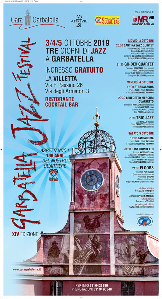 GARBATELLA JAZZ FESTIVAL 2 Ottobre 20192 Ottobre 2019 di giancarlo VI ASPETTIAMO TUTTI DA DOMANI SERA ALGARBATELLA JAZZ FESTIVAL. MUSICA, BAR, RISTORANTE. PER INFO: 331 6423680PRENOTAZIONI: 331 9496348 Potrebbe interessarti anche:Anteprima Garbatella Jazz Festival 2015Garbatella-Jazz-Festival-2013Jazz d invernoJAZZ ALLA VILLETTA VENERDI' 17 APRILEGarbatella Jazz Festival (GJF) 2016 - ProgrammaMetal Jazz Trio, in attesa del Garbatella Jazz…Locandina 2012Roma Today - Metal Jazz Trio, in attesa del…Calendario Garbatella Jazz FestivalDal 22 al 24 settembre XV°edizione delGarbatella…