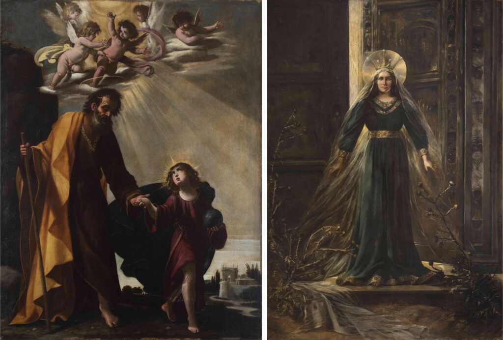 Tra queste, La Madonna del Cardo di Emma Regis, in cui la Vergine ha il volto dell’attrice Elena Sangro; la Sacra Famiglia con San Giovannino di Daniele da Volterra, allievo di Michelangelo; e la suggestiva Morte di Caino di Giulio Aristide Sartorio, dipinta con le mani come gesto di condanna alla violenza.