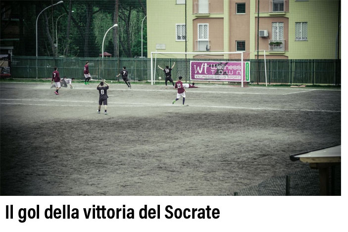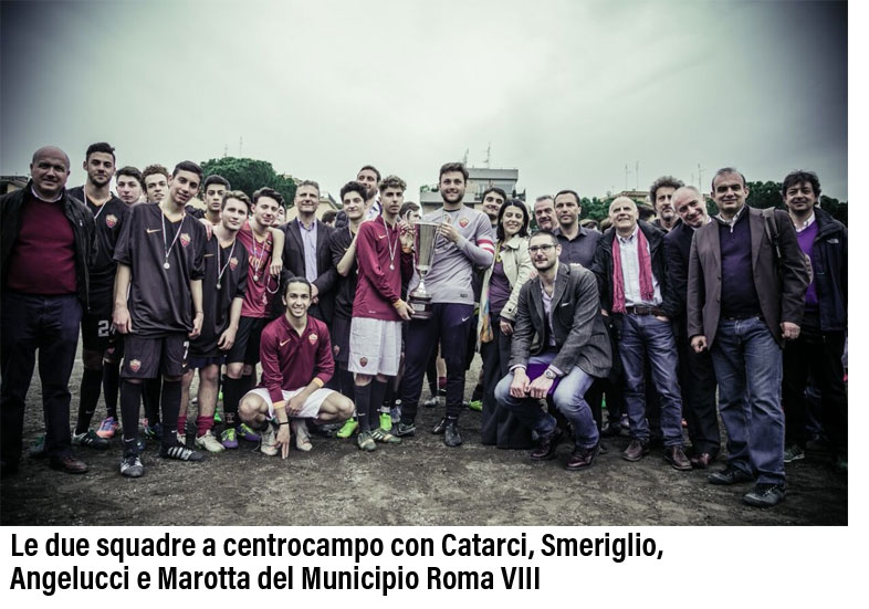 Il primo tempo è di chiara marca caravaggesca anche se è il Socrate con un lampo improvviso, traversa colpita con secco tiro da venti metri, a sfiorare il vantaggio. Nella ripresa cambia il ritmo della musica e il dominio del liceo della Garbatella si concretizza nel punto segnato da Landini che in diagonale infila il portiere avversario capitalizzando l’assist di Martino. La risposta dei rossi di Tor Marancia non si fa però attendere e almeno in tre occasioni si falliva il più giusto dei pareggi. Alla fine premi e le targhe erano soprattutto un pretesto per ragionare ancora sulla giornata e per fissare nuove scadenze d’incontro. Da Massimiliano Smeriglio e Andrea Catarci la coppa rimessa a lucido passava poi a Luca Di Bartolomei che, sotto gli occhi di Bruno Mazzone centrocampista reduce della vittoria del ’72, la consegnava al portiere del Socrate. “E’ con grande affetto ed emozione – ha sottolineato Luca – che passo questo ricordo di Agostino. Lo faccio invitando tutti a dedicare un po’ di giusta memoria non tanto a lui che è stato campione quanto a coloro che con lui hanno condiviso quegli anni e quelle soddisfazioni, che sono persone normali e che magari lavorano per rendere i nostri quartieri posti buoni dove vivere bene. E lo faccio, ancora, dicendo che è la prima ma l’ultima volta.
