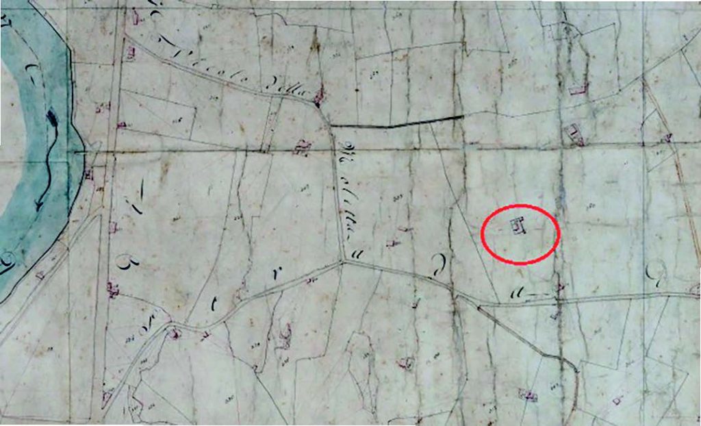 La mappa del Catasto Gregoriano. Nella foto a destra un ingrandimento che mette in risalto la pianta della Villetta -