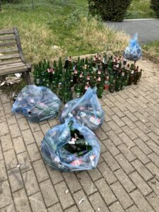 Impressionante il numero di bottiglie di birra recuperate – ma ce ne erano anche di superalcolici – e portate poi alle campane per la raccolta del vetro. Sconcertante anche il numero dei vetri rotti recuperati tra i viali.